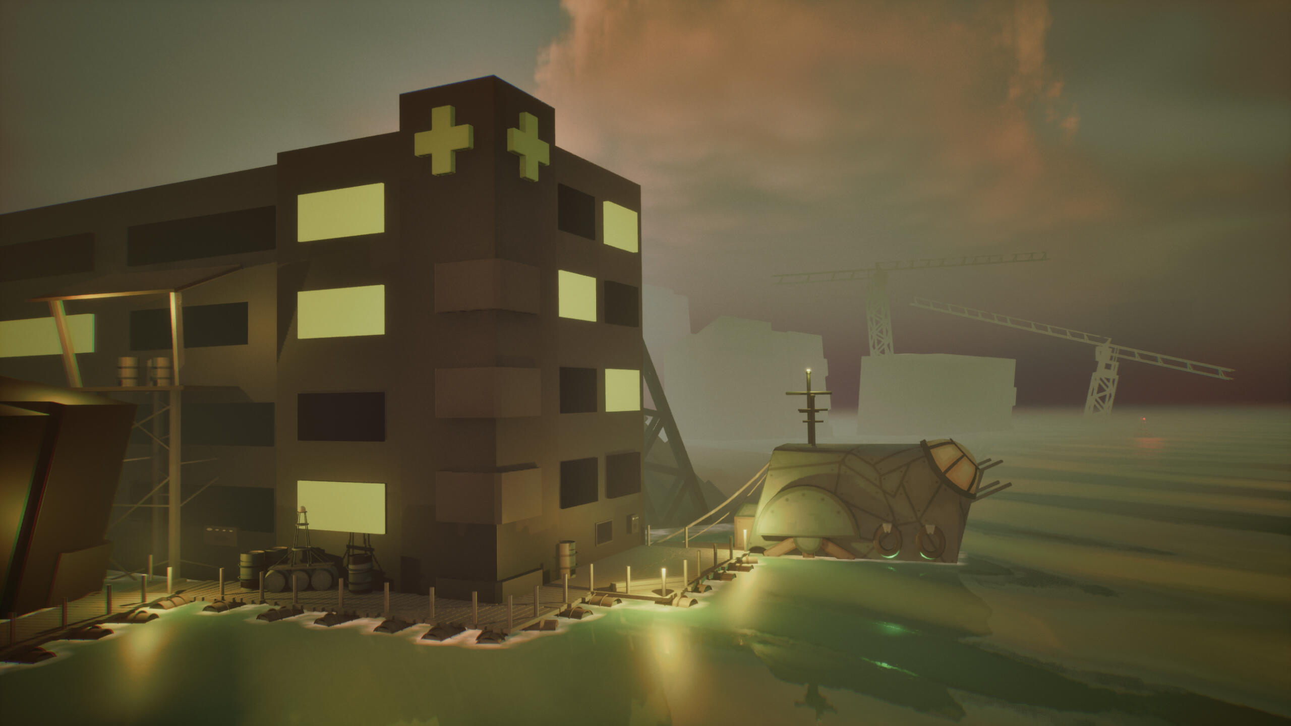 Below Deck’s narrative implementation following the prototype was planned to be a mix of environmental storytelling in collaboration with artists, and storytelling through dialogue. This trimester, my work mainly involved planning for this implementation for a wider scope.Communicating the wider narrative in a game like Below Deck would involve narrative delivery without direct storytelling, so plentiful worldbuilding alongside the artists of the team took place. The game’s story would be mostly inferred by the player, so small fragments of the universe would peek through at any given time of gameplay.Plans for environmental worldbuilding included emblazoned decals of the company responsible for the flooded earth commonly found on scrap, and survivors building their shelters out of remnants of established buildings. This was to communicate the desperate nature of the society that the player would explore, and hint towards the origins of the apocalypse.Players would be able to gain more insight over this matter through communications with NPCs, mentions of major events and perspectives dotted through mission briefs. Below Deck’s narrative implementation was less straightforward, but a delightfully challenging task to undertake the beginnings of.